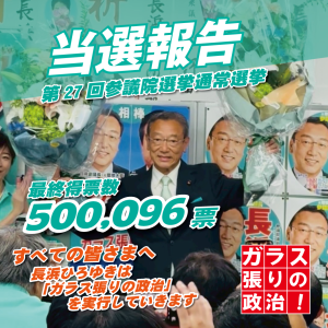 インターネット選挙が解禁となった最初の国政選挙。388,529票をいただき再選。国会では国家基本政策委員長に就任。また、環境委員会委員と北朝鮮による拉致問題等に関する特別委員会委員を拝命。