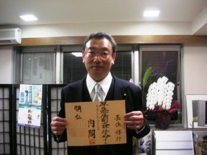 正式には夕方から皇居で行われる認証式を経て正式に就任になります。副大臣は天皇陛下から直接辞令をいただくので、その予行練習(とても細かい動作、作法?がありました)に1時間近く費やし、何とか大きな失敗もなく?式を終え、すぐに官邸に戻って記念撮影、初副大臣会議となりました。
